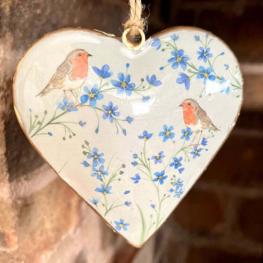 Robin & Forget-Me-Not Metal Hanging Heart | Country Decor