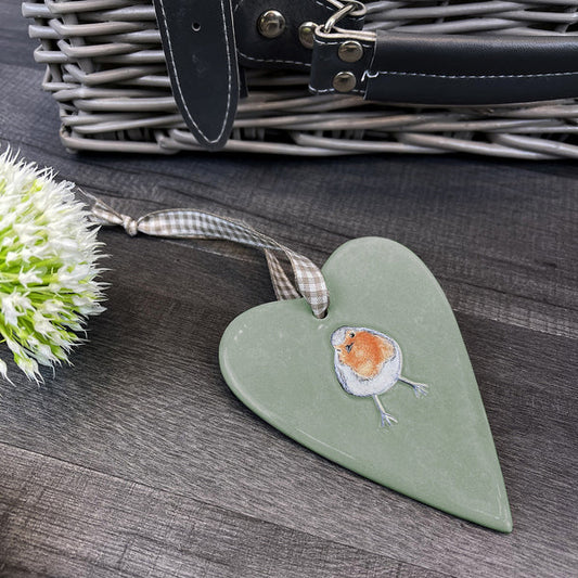 Robin Ceramic Heart Plaque with Tartan Ribbon