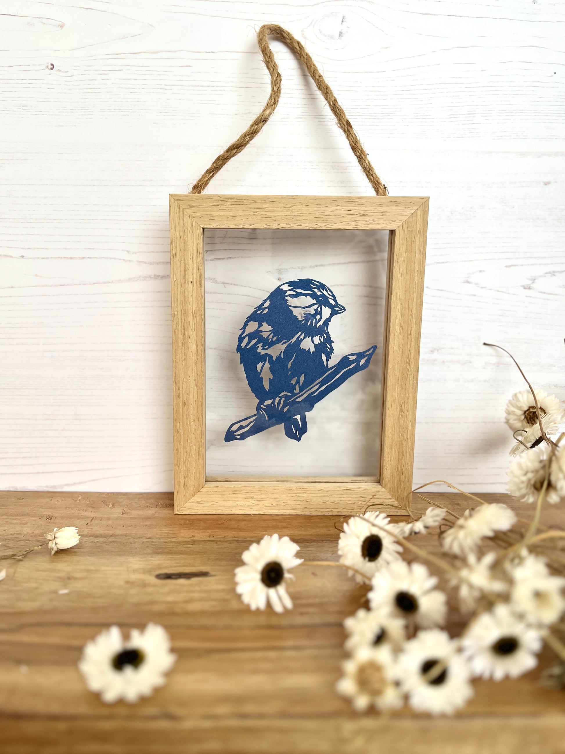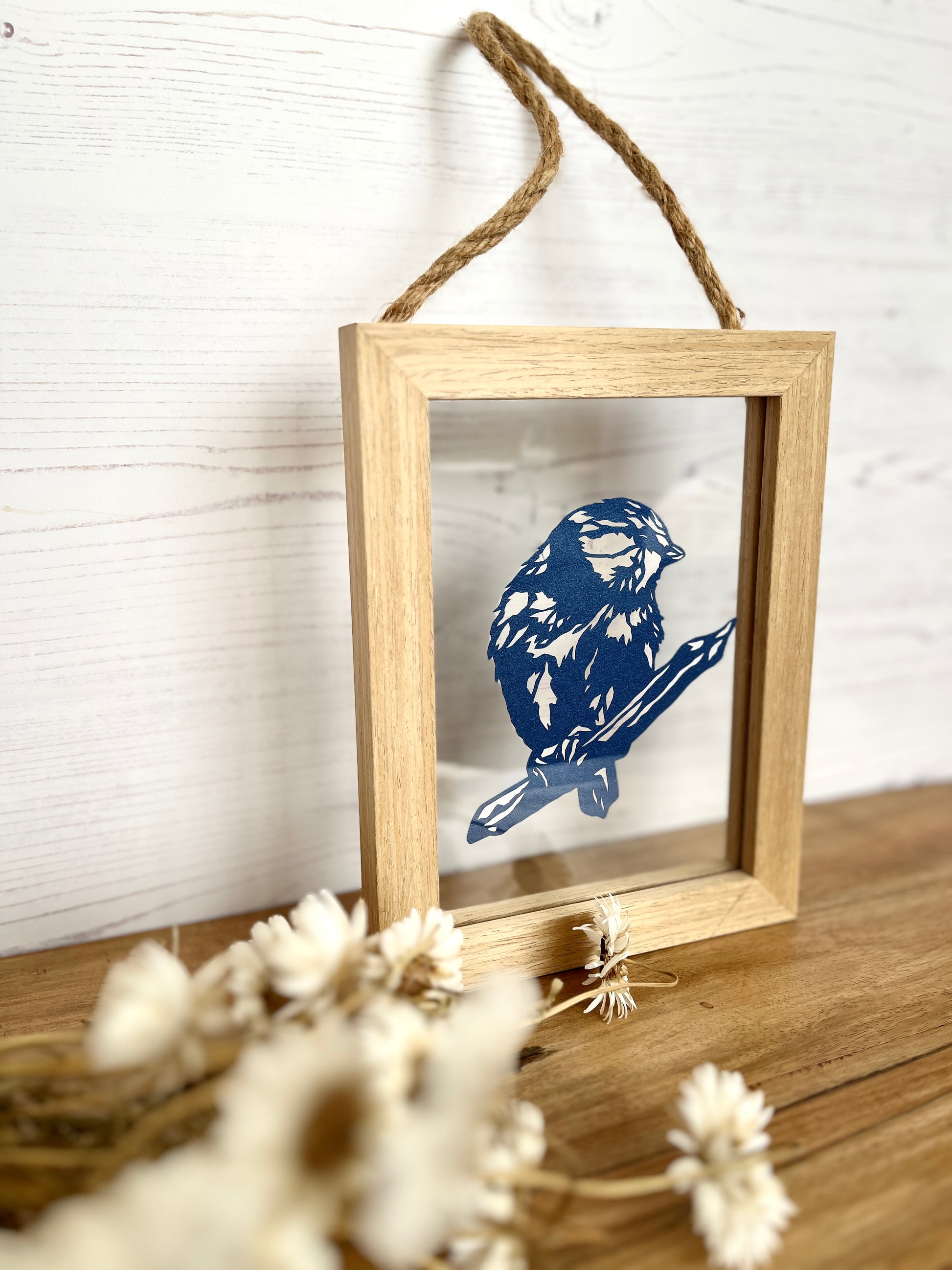 Expertly crafted, this blue tit framed papercut showcases an intricate portrayal of a beloved bird. With intricate paper cutting techniques, this piece is a beautiful addition to any space. The double glass frame and jute string rope add a unique touch, making it a perfect gift for any bird enthusiast.
