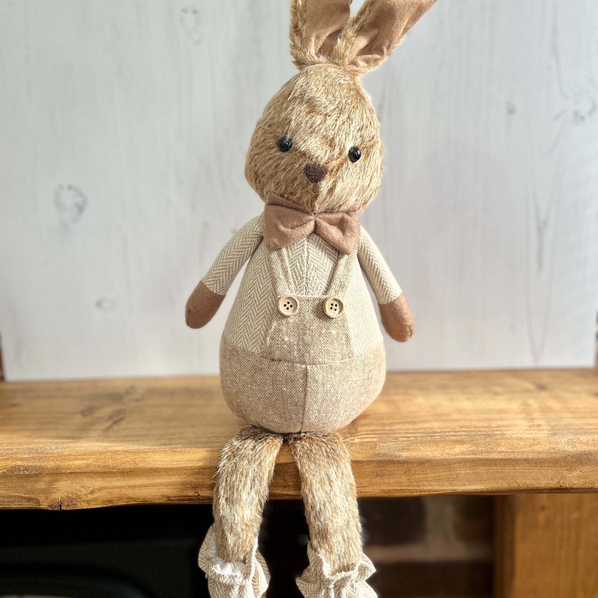 Add a charming touch to your Easter decor with these dangling legs plush bunny shelf sitters! Choose Mr. Bunny, dressed in dungarees with a dicky bow, or Mrs. Bunny, wearing a dress with a frill collar and a flower on her head. With their playful dangly legs, they're perfect for sitting on shelves, mantels, or tabletops, making them a whimsical farmhouse-style addition to your spring decor!
