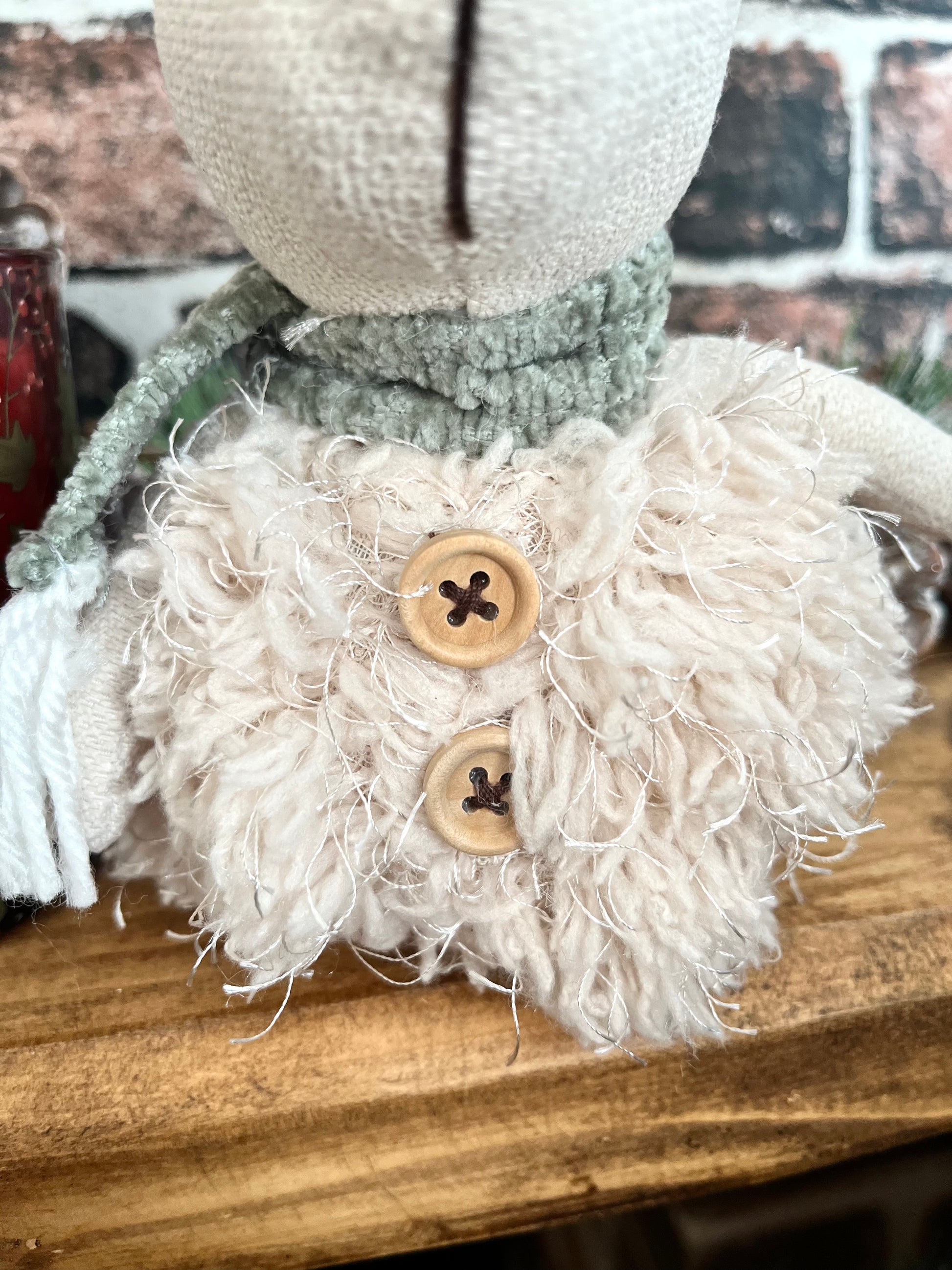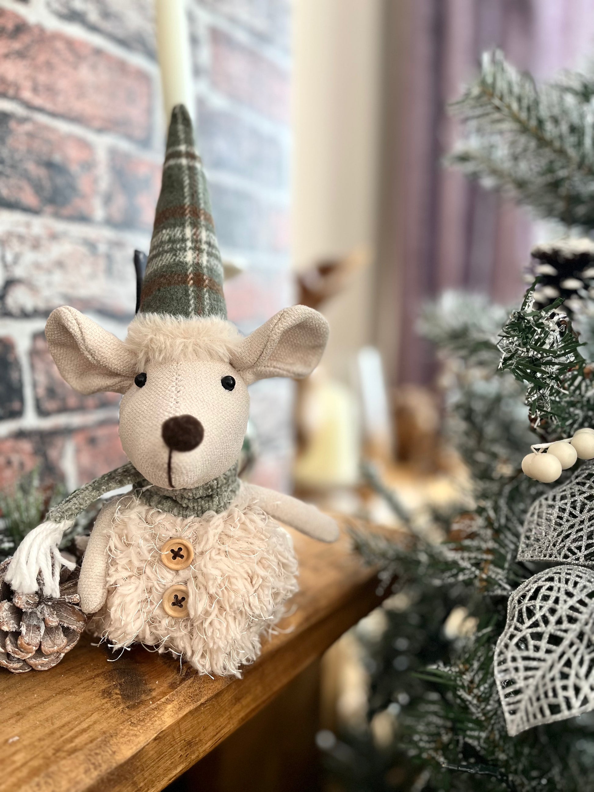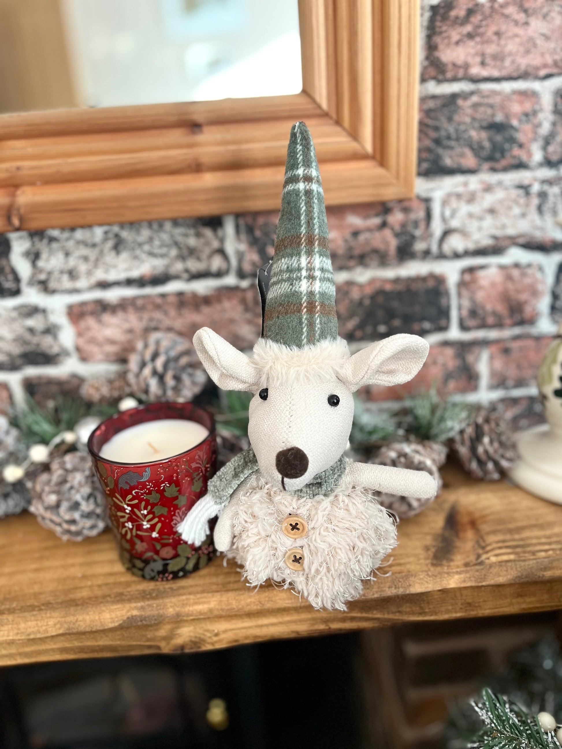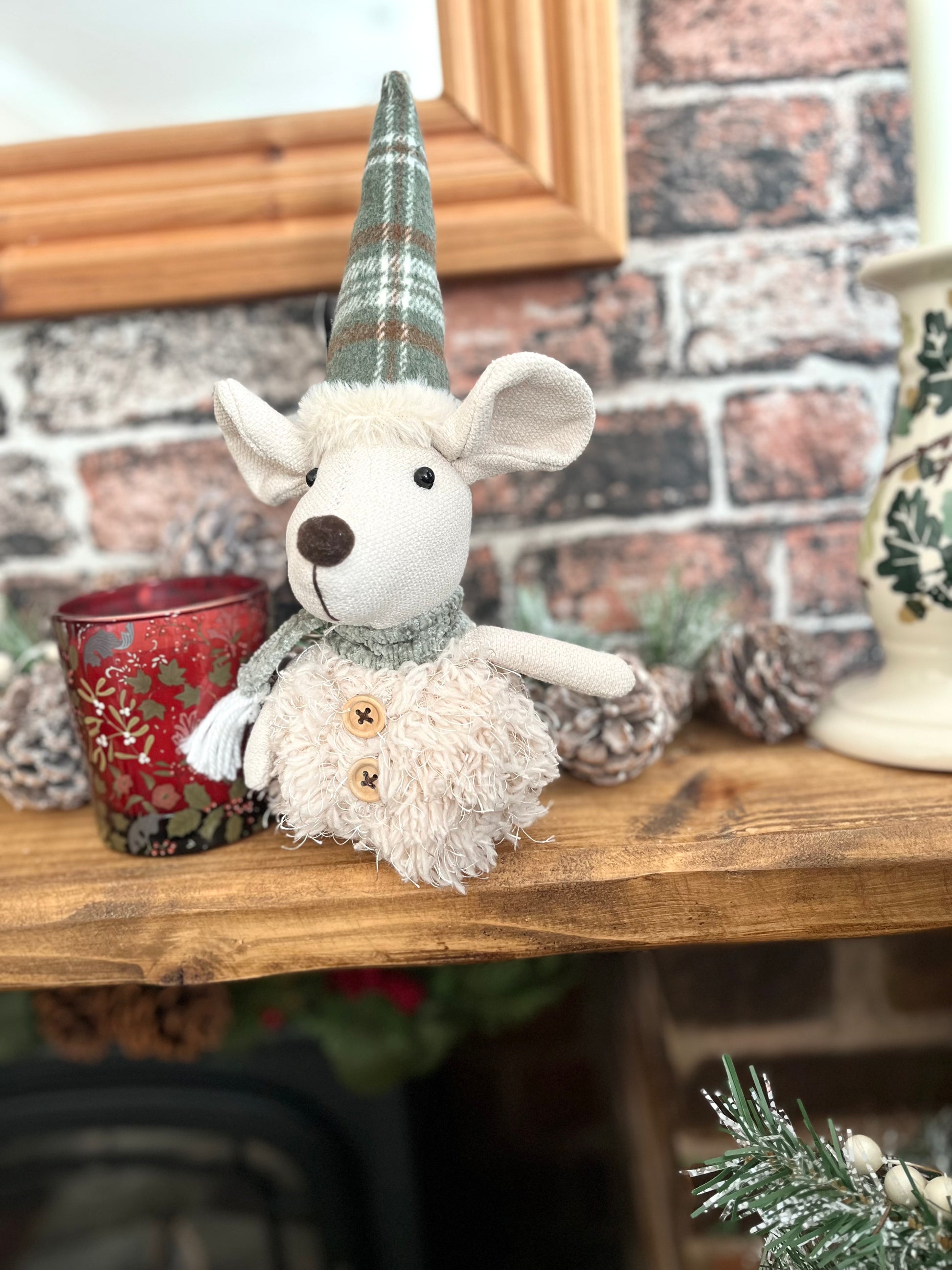 This festive fabric mouse shelf sitter will bring Christmas cheer to any space. Featuring a tartan green pointy hat and a fluffy green scarf, this plush mouse is the perfect addition to your seasonal decor. Bring a touch of charm and whimsy with this adorable festive accessory.