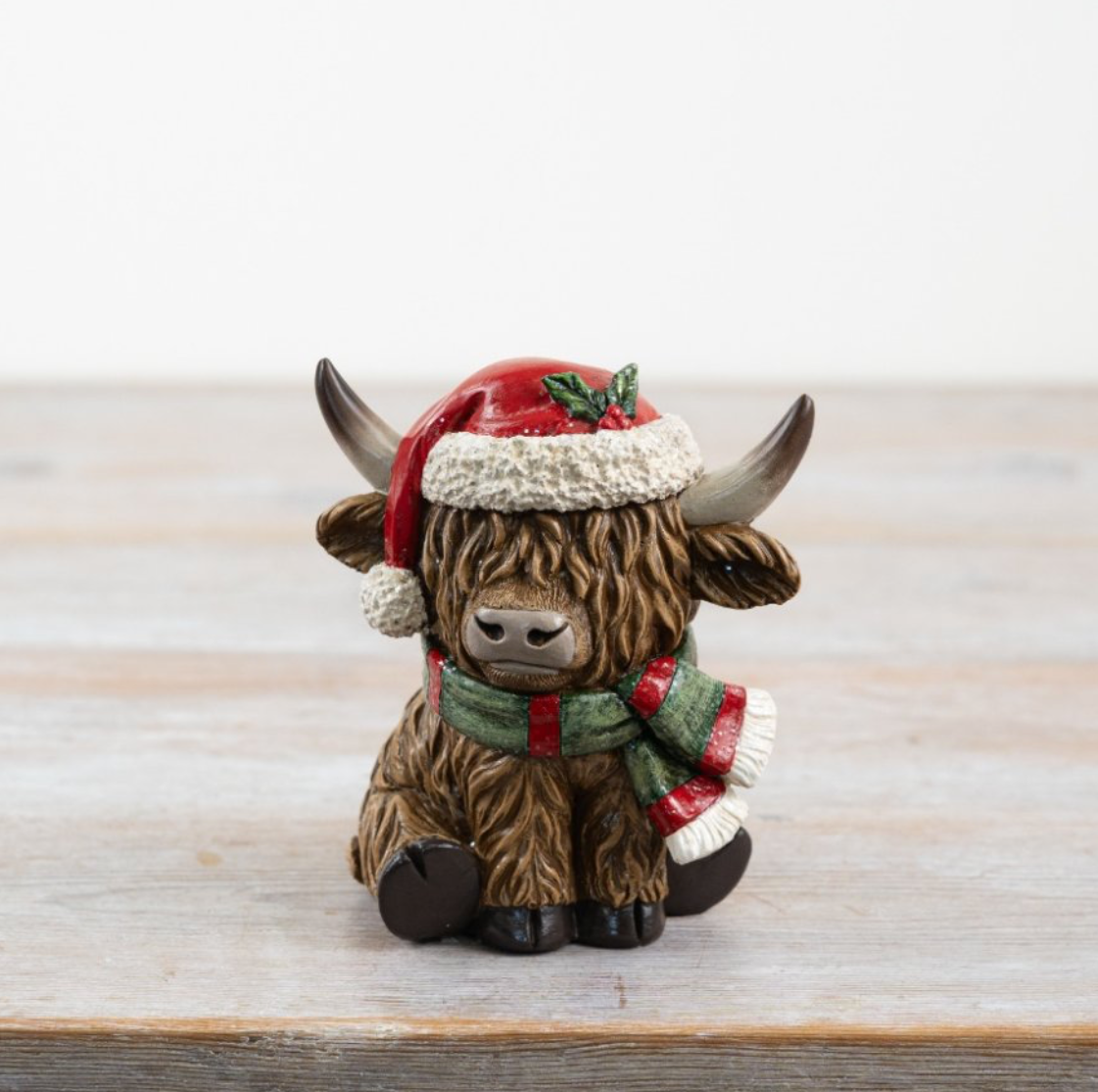 Bring a touch of rustic charm to your Christmas decor with this cute Highland Cow figurine. Crafted from durable resin, this adorable little cow is cosily seated, donning a glittery Santa hat and a warm scarf, perfect for adding countryside Christmas spirit to any room. Its detailed design and festive sparkle make it a delightful conversation starter and a cheerful companion for your seasonal celebrations.