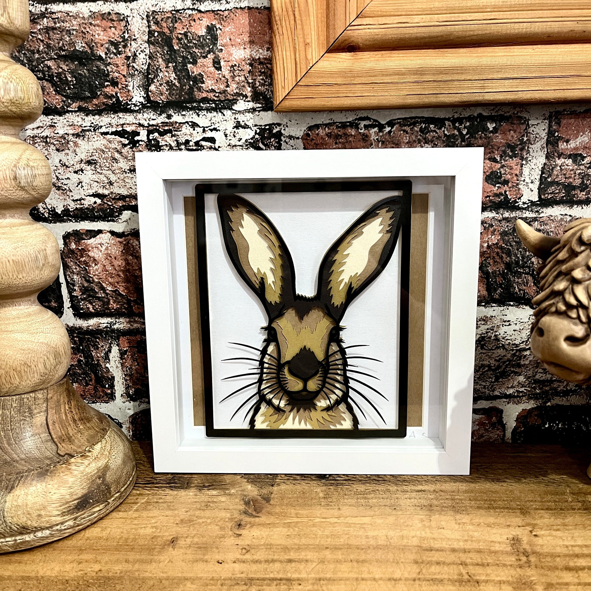 Enhance your space with our hare face layered paper art. Using the papercutting technique, this piece boasts intricate details and a layered design, creating a stunning 3D effect. Made with various metallic and matte cardstock, this artwork adds a touch of country charm to any room.