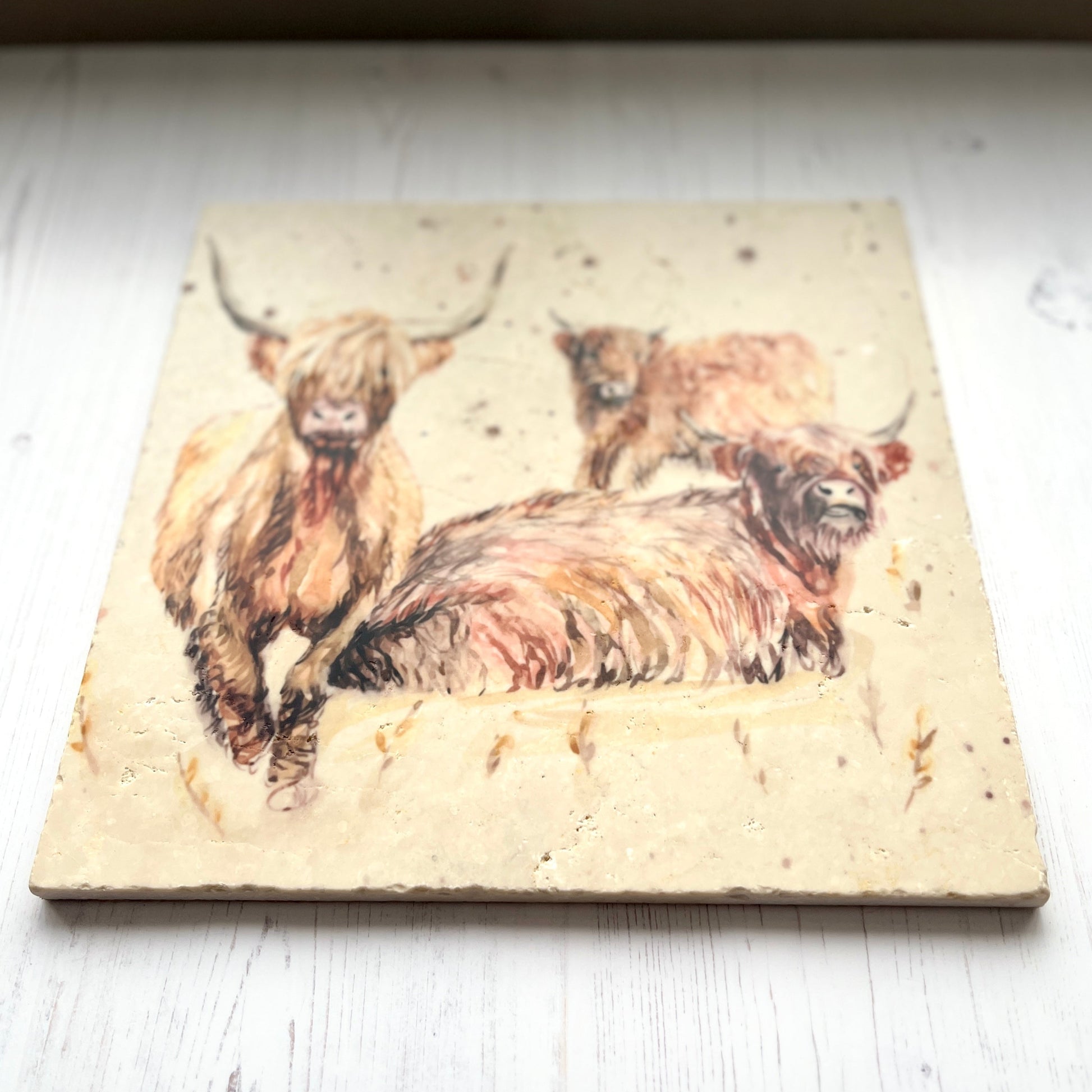 This unique marble trivet features an illustrated highland cow family, showcasing the beautiful natural marble markings. With its country style and multipurpose design, it is perfect for both functional and decorative use. Get yours today and add a touch of farmhouse to your home.