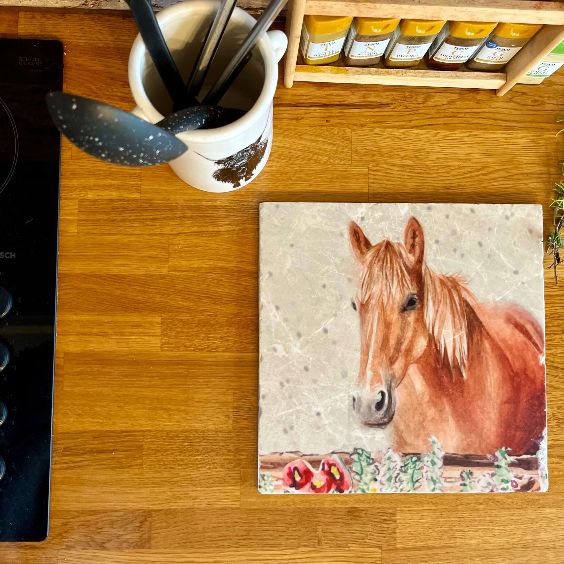Expertly crafted from marble, this large horse trivet features a stunning horse head design and unique natural markings. Designed exclusively for Sabel Lane, it is not only a beautiful addition to any kitchen, but also a versatile piece that can be used for hot dishes, serving platters, and more. Elevate your home decor with this elegant and functional trivet.