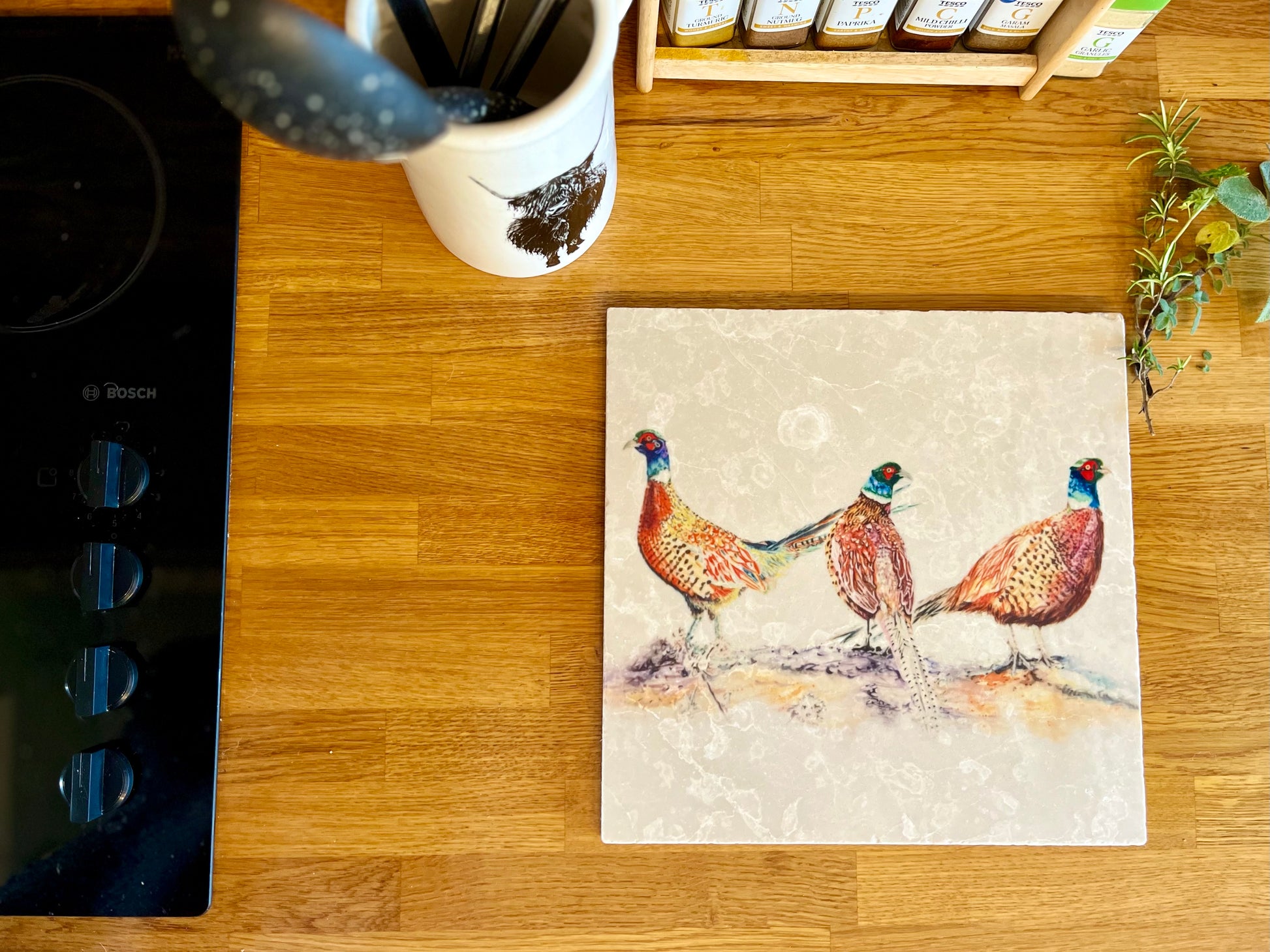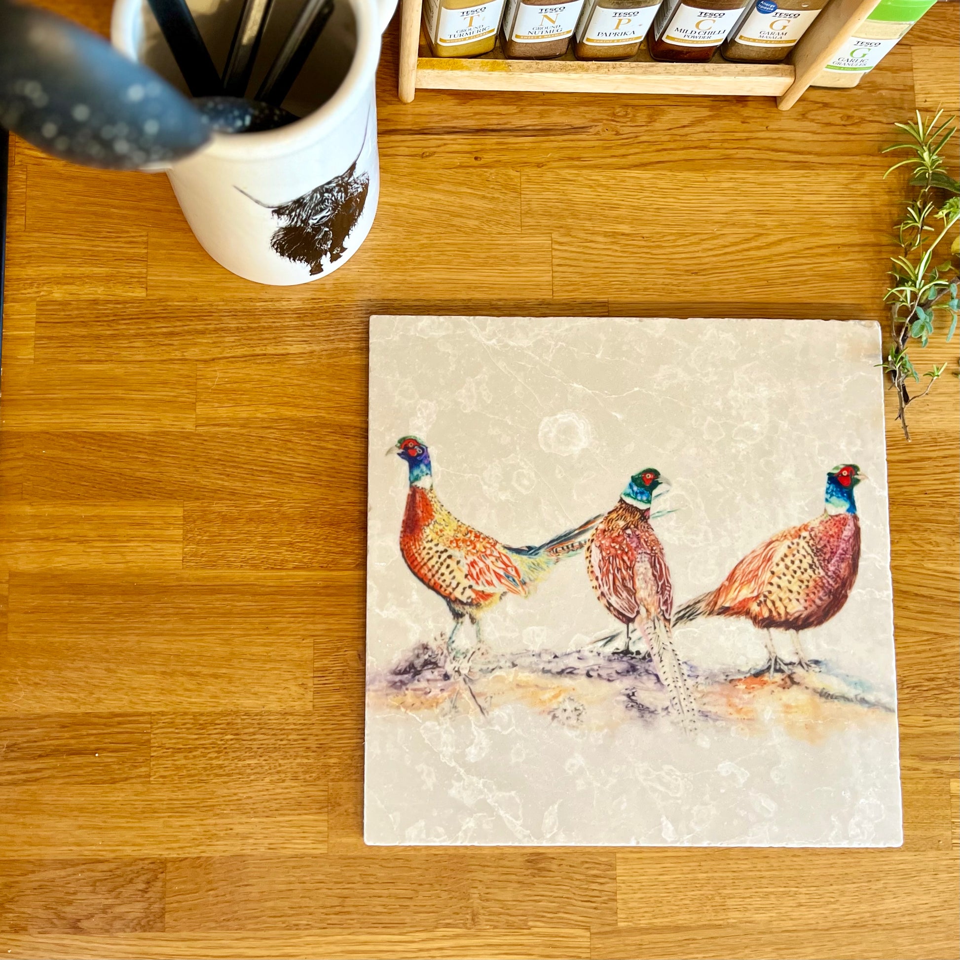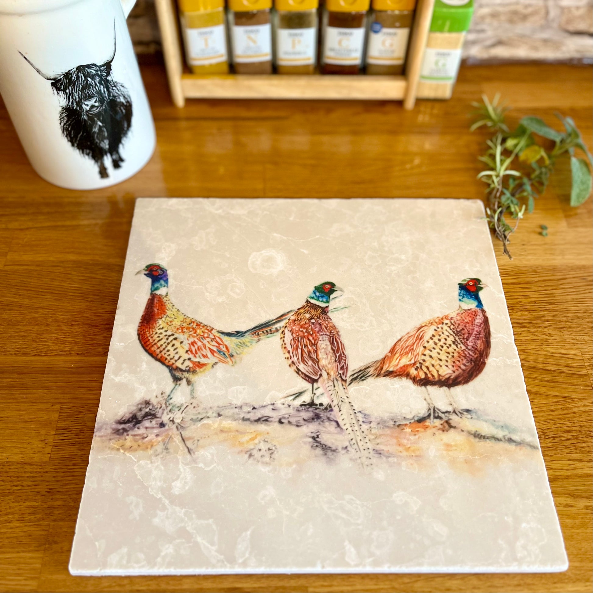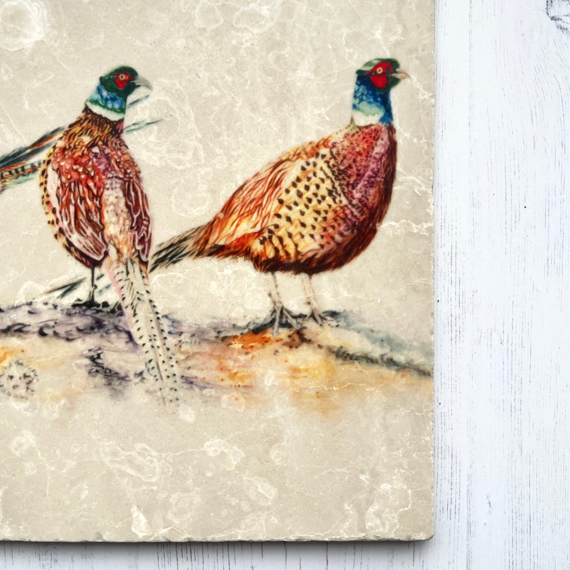 This large pheasant marble trivet features a beautifully detailed male pheasants illustration, adding a touch of country lifestyle charm to your kitchen or dining area. Made of natural marble, each trivet showcases unique markings, making it both functional and a striking decorative piece.