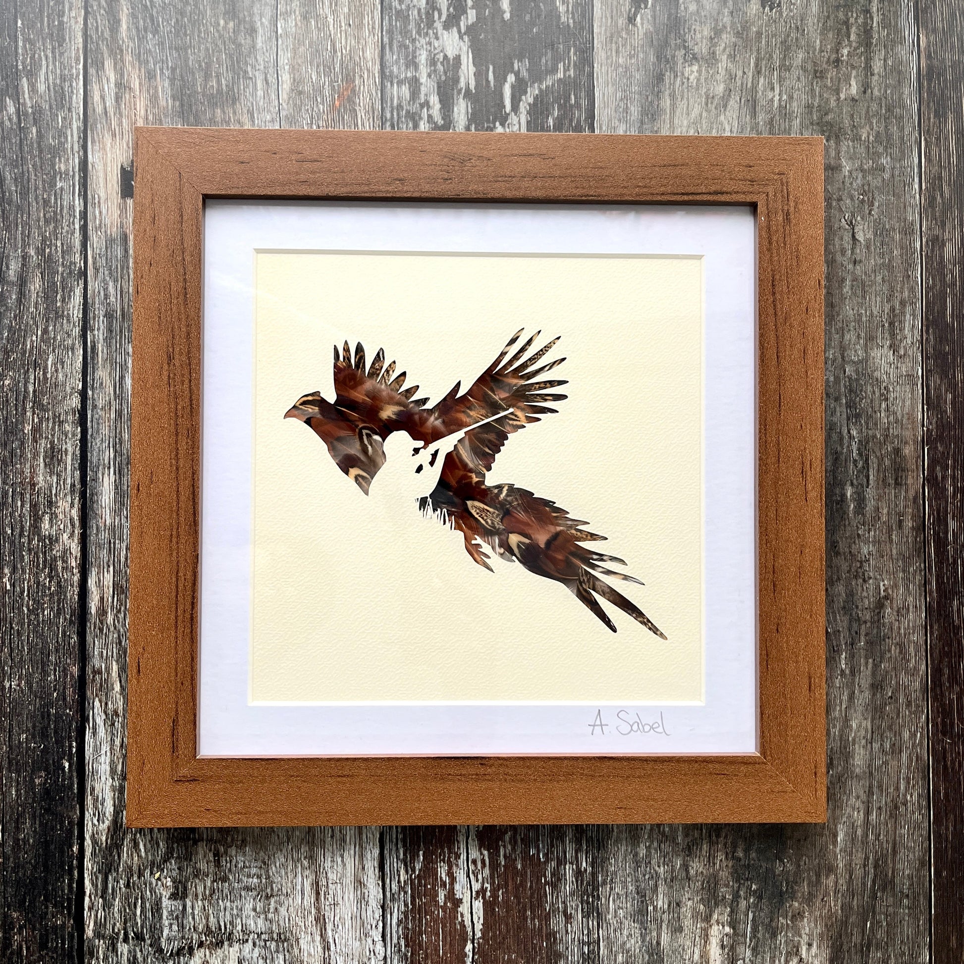 Wood, perspex, cardstock, natural game bird feathers