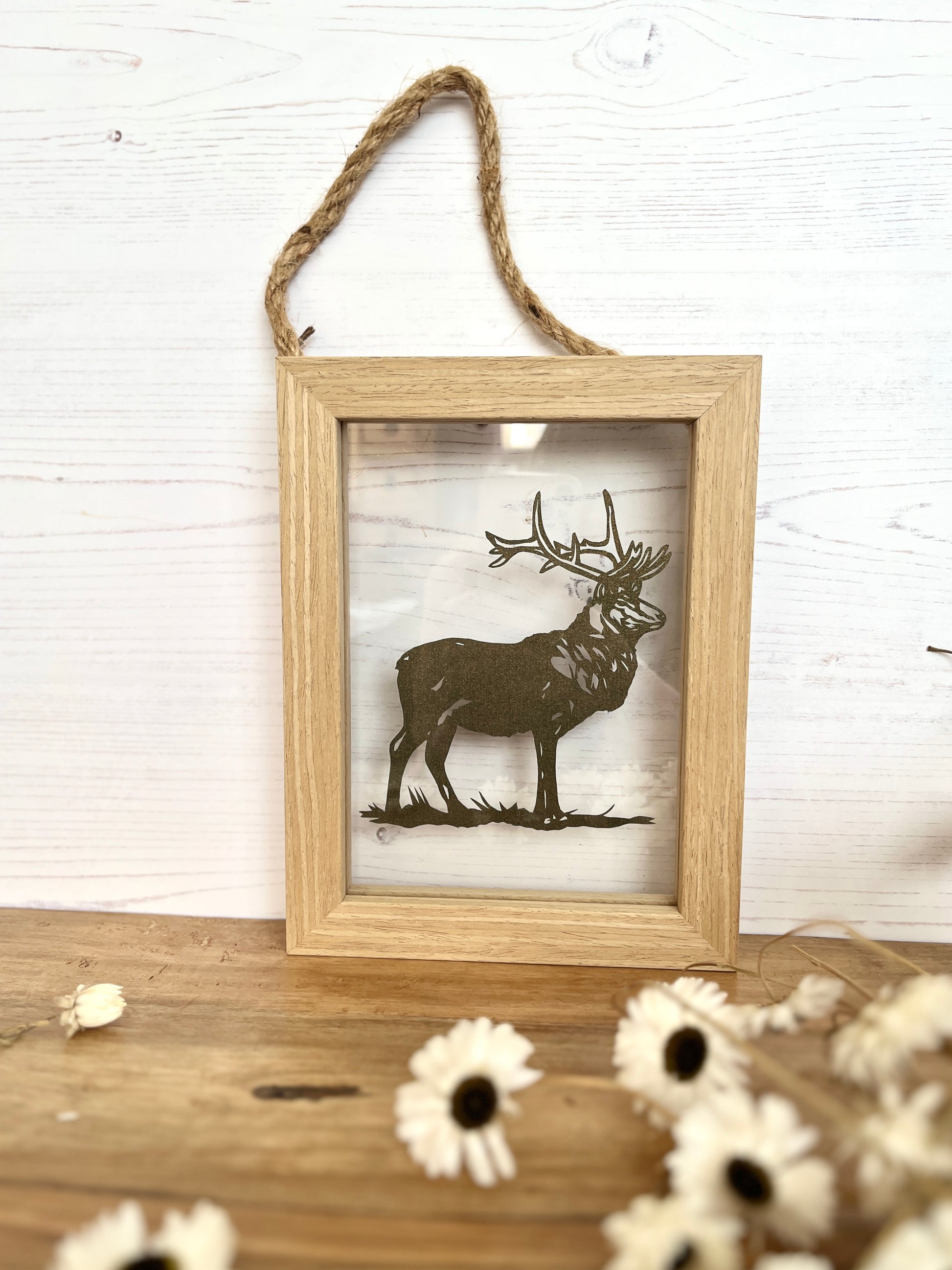 Add a touch of nature to your home with this beautifully hand-crafted red deer stag framed papercut. Made with gold cardstock in a double glass frame, with rustic jute rope ready for hanging, this stunning piece holds a paper cut design of a regal red deer stag. Perfect for any art enthusiast or animal lover.