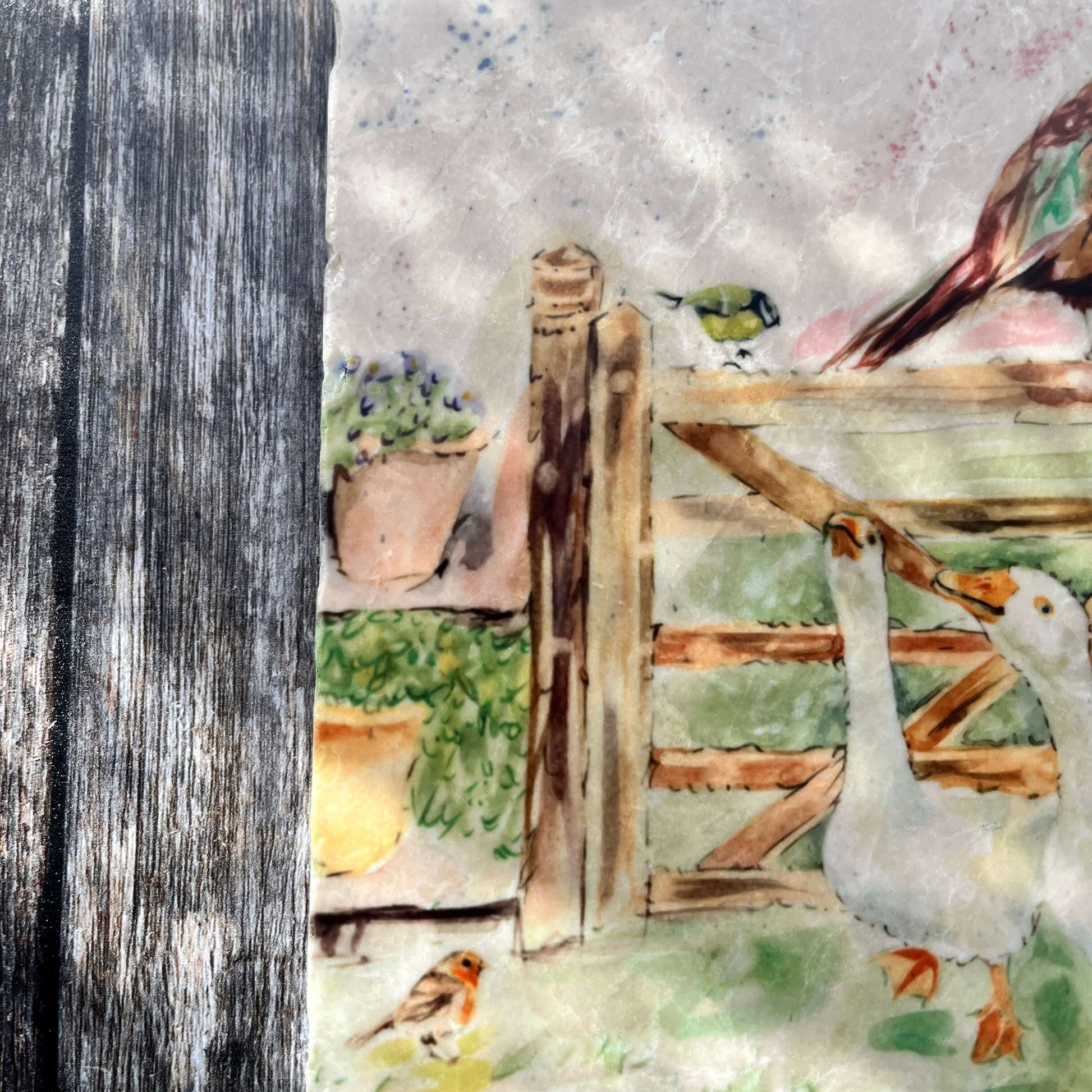 Add a touch of countryside charm to your kitchen with this beautifully crafted square marble trivet, featuring a stunning watercolour illustration of pheasants, geese, and other birds. Perfect for protecting your surfaces from heat and scratches, this elegant yet practical piece blends rustic style with timeless sophistication.