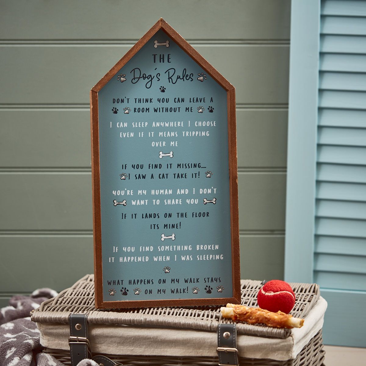 This humorous plaque featuring the "Dog's Rules" is perfect for any pet owner. Made of wood, the freestanding or hanging design adds versatility to any decor. Show off your love for your furry friend with this fun frame.