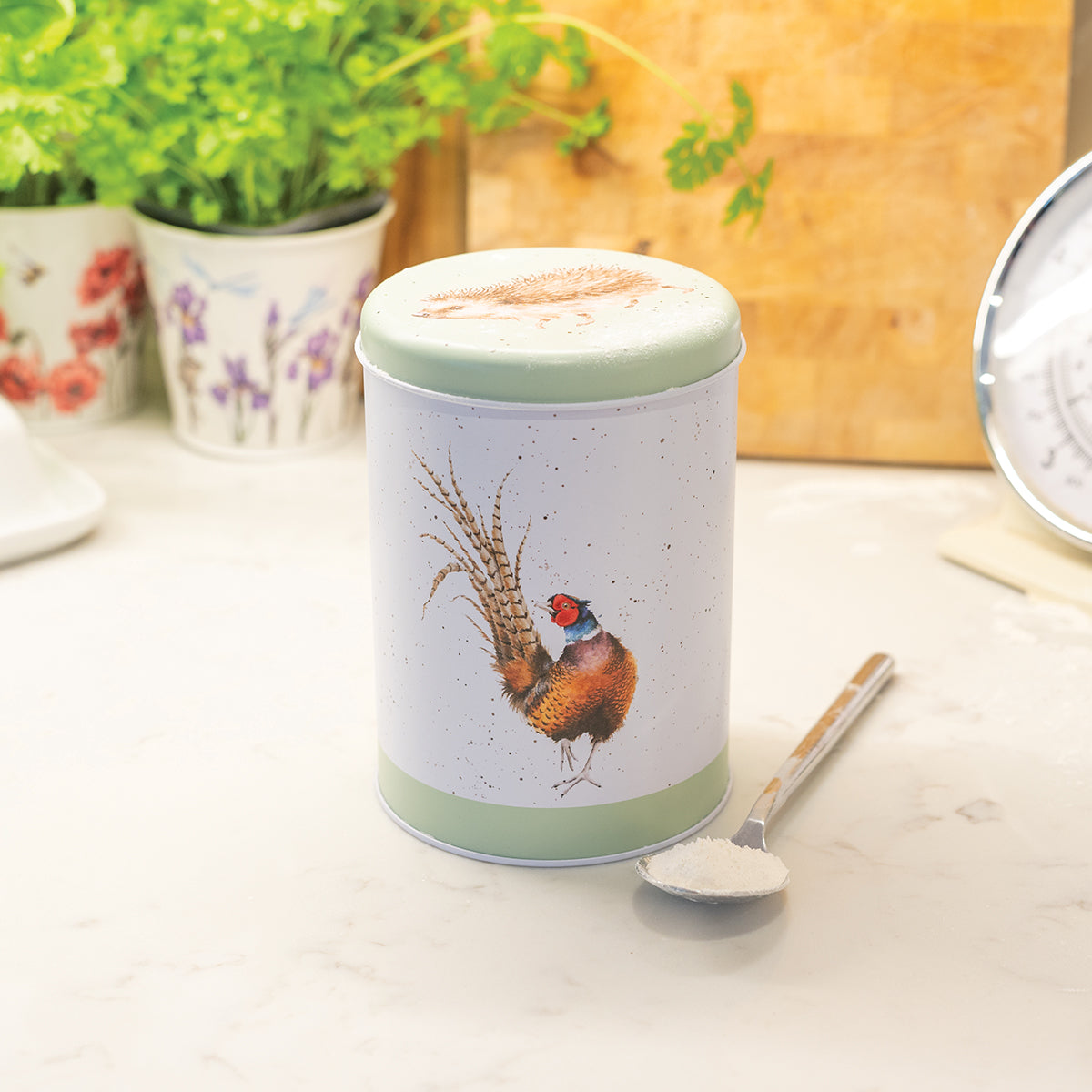 This round canister from Wrendale Designs showcases a beautiful hand-painted pheasant, hare, hedgehog, and roe deer. Not only does it add a charming touch to your kitchen, but it also keeps your food fresh and can double as a keepsake container. Expertly crafted and designed for both functionality and aesthetics.